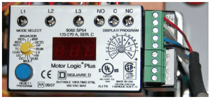 It is common for the network interface module inside the bucket to have its own digital display for local indication of these parameters as well. A close-up photograph of a Square-D “Motor Logic Plus” unit shows some of its locally accessible features: