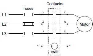 A schematic diagram of a three-phase contactor connected to a three-phase motor (with fuses for overcurrent protection) is shown here: