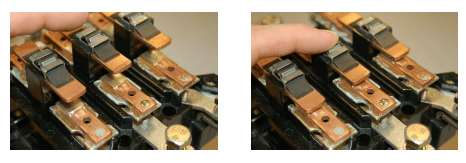 Of course, it would be highly unsafe to touch or manually actuate the contacts of a motor starting relay with the cover removed as shown. Not only would there be an electric shock hazard from touching any one of the bare copper contacts with your finger, but the arcing produced by closing and opening such contacts would pose a burn and blast hazard. Therefore all modern motor contactors are equipped with arc shield covers. The switch contact pads are not made of pure copper, but rather silver (or a silver alloy) designed to survive the repeated arcing and blasting action of large AC currents initiated and interrupted.