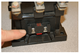 Below the main power (line) connection terminals on this contactor hide two small screw terminals providing connection points to the electromagnet coil actuating the contactor:
