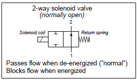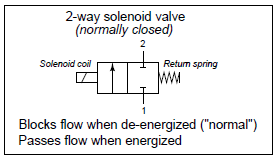 The arrow inside a solenoid valve symbol denotes a preferred direction of flow. Most solenoid valves use a “globe” or “poppet” style of the valve element, where a metal plug covers up a hole (called the “seat”). Process fluid pressure should be applied to the valve in such a way that the pressure difference tends to hold the solenoid valve in its “normal” position (the same position as driven by the return spring). Otherwise, enough fluid pressure might override the return spring’s action, preventing the valve from achieving its “normal” state when de-energized. Thus, we see that the label “2-way” does not refer to two directions of flow as one might assume, but rather two ports on the valve for fluid to travel through.