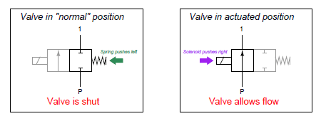 A good way to make sense of these “box” valve symbols is to imagine the boxes sliding back and forth as the actuating elements work. For example, the two boxes in a normally closed solenoid valve symbol may be thought of as pushed to one side by the spring (in its de-energized state) and pushed the other direction by the solenoid’s force (when energized). Here, the color grey de-emphasizes the unselected box in each of the valve’s two states:
