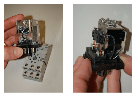 A common package for industrial relays is the so-called ice cube relay, named for its clear plastic case allowing inspection of the working elements. These relays plug into multi-pin base sockets for easy removal and replacement in case of failure. A DPDT “ice cube” relay is shown in the following photographs, ready to be plugged into its base (left) and with the plastic cover removed to expose both sets of Form-C contacts (right):