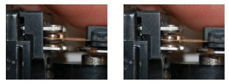 A closer view of one Form-C contact shows how the moving metal “leaf” contacts one of two stationary points, the actual point of contact being made by a silver-coated “button” at the end of the leaf. The following photographs show one Form-C contact in both positions: