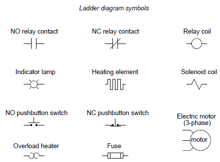 Ladder diagrams differ from regular schematic diagrams of the sort common to electronics technicians primarily in the strict orientation of the wiring: vertical power “rails” and horizontal control “rungs.” Symbols also differ a bit from common electronics notation: relay coils are drawn as circles, with relay contacts drawn in a way that resembles capacitors:
