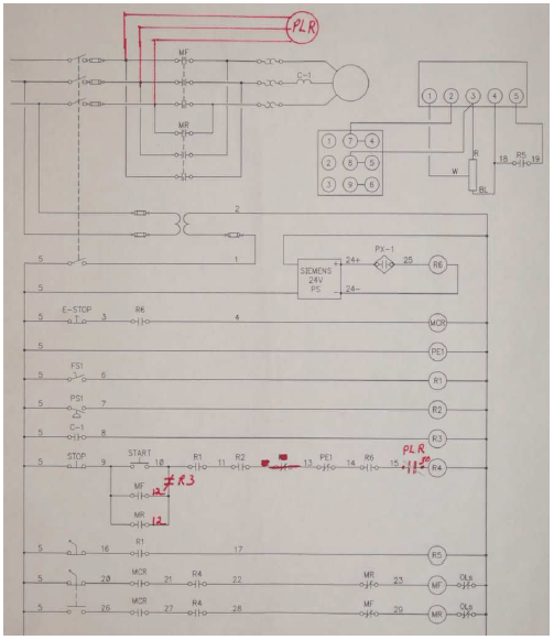 An actual ladder diagram of a relay-based motor control system is shown here, complete with red-line edits showing modifications to the circuit made by an industrial electrician: