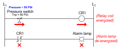 Since the pressure is insufficient to actuate the pressure switch, its contacts remain in the “normal” state (closed). This sends power to relay coil CR1, thus actuating contacts CR1 and holding them in the open state. With CR1 contacts open, the alarm lamp receives no power. In this example, we see the pressure switch in its “normal” state but the relay in the actuated state.
