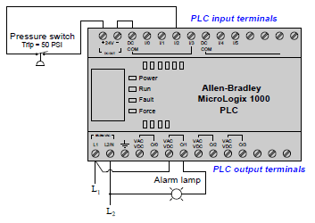 Here, we will emulate the exact same high-pressure alarm circuit using an Allen-Bradley MicroLogix 1000 PLC instead of a relay coil: