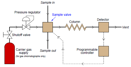The sample valve periodically injects a very precise quantity of samples into the entrance of the column tube and then shuts off to allow the constant-flow carrier gas to wash this sample through the length of the column tube. Each component of the sample travels through the column at different rates, exiting the column at different times. All the detector needs to do is be able to tell the difference between pure carrier gas and carrier gas mixed with anything else (components of the sample).