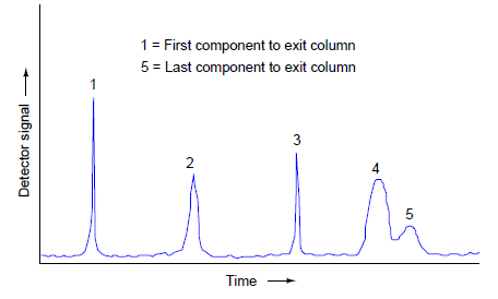 Narrow peaks represent compact bunches of molecules all exiting the column at nearly the same time. Wide peaks represent more diffuse groupings of similar (or identical) molecules. In this chromatogram, you can see that components 4 and 5 are not clearly differentiated over time. Better separation of components may be achieved by altering the sample volume, carrier gas flow rate, carrier gas pressure, type of carrier gas, column packing material, and/or column temperature.