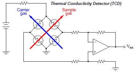A simplified diagram of a TCD is shown here, with pure carrier gas cooling two of the self-heated thermal sensors and sample gas (mixed with a carrier gas, coming off the end of the column) cooling the other two self-heated sensors. Differences in thermal conductivity between gas exiting the column versus pure carrier gas will cause the bridge circuit to unbalance, generating a voltage signal at the output of the operational amplifier circuit: