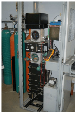 Although the column cannot be seen in this photograph of the GC, several high-pressure steel “bottles” may be seen in the background holding carrier gas used to wash the natural gas sample through the column.
