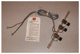 The following photograph shows such a direct-contact style of conductivity probe, consisting of stainless-steel electrodes contacting the fluid flowing through a glass tube:
