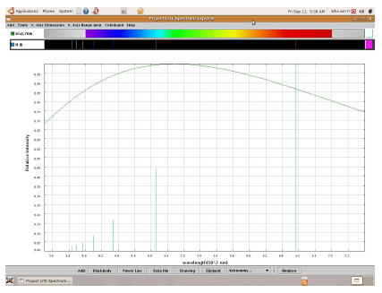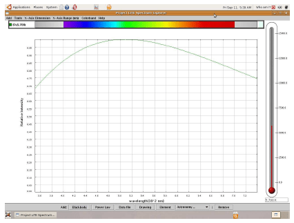 If we examine the visible light spectrum (a range of wavelengths spanning 700 nm to 400 nm, corresponding to a range of frequencies spanning 4.29 × 1014 Hz to 7.5 × 1014 Hz) emitted by a blackbody heated to a temperature of 5700 Kelvin, we see a continuous spectrum of color from violet on the left (short wavelength, high frequency, high energy) to red on the right (long wavelength, low frequency, low energy). Here, I am using a computer program called Spectrum Explorer (SPEX) to map both the color spectrum and the intensity of radiation across a range of wavelengths: