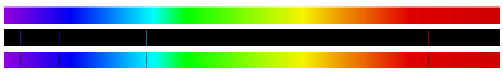 The following illustration shows three different spectra: the full-color (white light) spectrum of white light (top), the emission spectrum of hydrogen gas (middle), and the absorption spectrum of hydrogen gas (bottom). Note how the dark gaps in the absorption spectrum precisely match the positions and colors of the bright lines in the emission spectrum, because the wavelengths of light absorbed from white light as it passes through hydrogen gas are the exact same wavelengths emitted by hydrogen gas when stimulated by an electric spark in a glass tube: