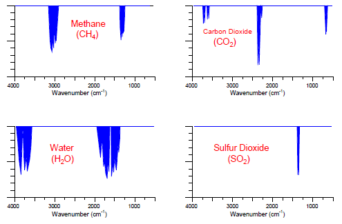 Molecule types most effective at absorbing infrared light are those comprised of different atom types, such as carbon monoxide (CO), carbon dioxide (CO2), sulfur dioxide (SO2), water vapor (H2O), and oxides of nitrogen (NOx). Molecules formed of two identical atoms such as molecular oxygen (O2), nitrogen (N2), and hydrogen (H2) exhibit negligible interaction with infrared light.