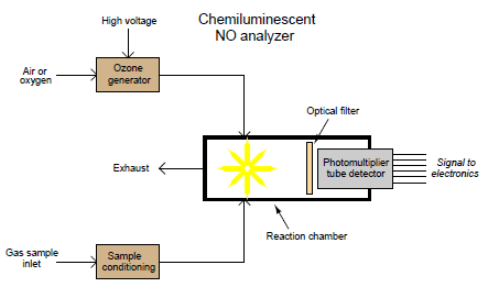 Certain industrial compounds engage in chemiluminescent reactions, and this phenomenon may be used to measure the concentration of those compounds. One such compound is nitric oxide (NO), an atmospheric pollutant formed by high-temperature combustion with air as the oxidizer.