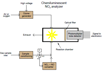 A simplified diagram for a chemiluminescent nitric oxide gas analyzer appears here: