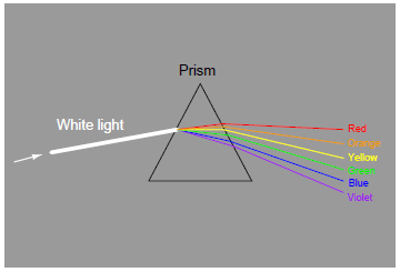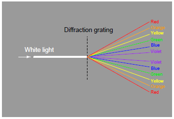 A modern variation on the theme of a solid glass prism is a thin diffraction grating, causing the light of different wavelengths to “bend” as they pass through a series of very thin slits:
