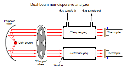 Another detector problem remains, in that an imbalance will develop if one detector happens to “drift” in voltage apart from the other, so they are no longer in perfect counterbalance even with the same received light intensities. This might happen if one of the thermopiles experiences greater ambient temperatures than the other, perhaps due to heat from the hot process sample gas entering the sample cell and not the reference cell. An ingenious solution to this problem is to insert a spinning metal “chopper” wheel in the path of both light beams, causing the light beams to pulse through the sample and reference cells at a low frequency (typically a few pulses per second):