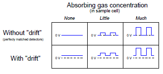 The effect of the “chopper” is to make the detector assembly output a pulsating (“AC”) voltage signal rather than a steady voltage signal. The peak-to-peak amplitude of this pulsating signal represents the difference in light intensity between the two detectors, but any “drift” will manifest itself as a constant or very slowly changing (“DC”) bias voltage. The following table illustrates the detector assembly signal for three different gas concentrations (none, little, and much) both with and without a mismatch in detector signals due to thermal drift: