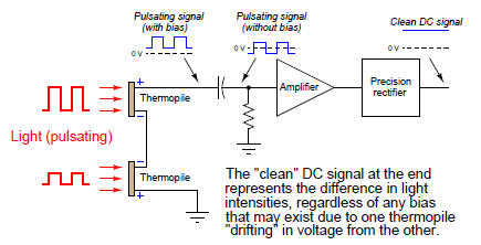 With the detector assembly producing an “AC” (pulsing) signal instead of a “DC” signal, and by using capacitive coupling to the amplifier, the electronic circuit responds only to changes in the amplitude of the AC waveform and not to its DC bias. This means the analyzer will only respond to changes in detector temperature resulting from changes in light absorbance (i.e. gas concentration), and not from any other factor such as ambient temperature drift. In other words, since the amplifier has been built to only amplify pulsing signals, and the only thing pulsing in this instrument is the light, the electronics will only measure the effects generated by the light, rejecting all other stimuli.