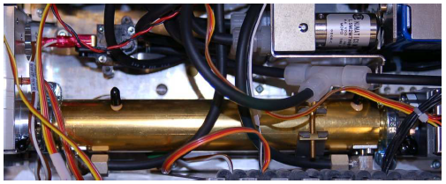 What looks like a single gold-colored gas cell is actually two cells (a divider separating the tube lengthwise into two chambers), one for the sample gas and the other for reference. Black-colored hoses pass sample gas through the bottom half of the tube, while the top half is filled with nitrogen gas (the tube connections are capped and sealed with black-colored plastic). The light source and chopper assembly appear on the left-hand side of the tube, while the detector resides on the right-hand side.