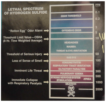 Hydrogen Sulfide (H2S) is a highly toxic gas, with a pungent “rotten eggs” odor at low concentrations but no visible color. At higher concentrations, the gas acts as a nerve agent to de-sensitize human smell, so that it seems odorless. Its paralytic effect on smell extends to more important bodily functions such as breathing, causing rapid loss of consciousness and asphyxiation. A photograph of a safety chart (taken at a wastewater treatment facility) shows just how toxic hydrogen sulfide gas is: