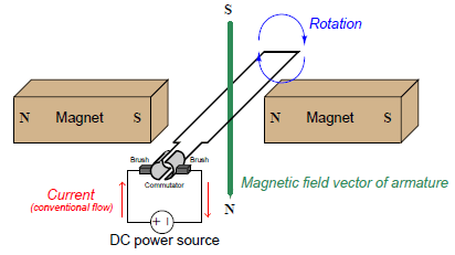 In any case, the operating principle of a DC electric motor is that current passed through the armature creates a magnetic field that tries to align with the stationary magnetic field. This causes the armature to rotate: