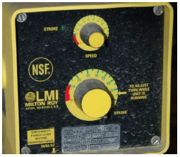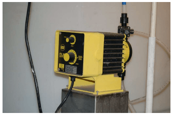 Metering pumps are commonly used in water treatment processes to inject small quantities of treatment chemicals (e.g. coagulants, disinfectants, acid or caustic liquids for pH neutralization, corrosion-control chemicals) into the water flowstream, as is the Milton-Roy unit shown in this photograph.