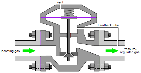 The following diagram shows how a self-operated, spring-loaded gas pressure regulating valve functions: