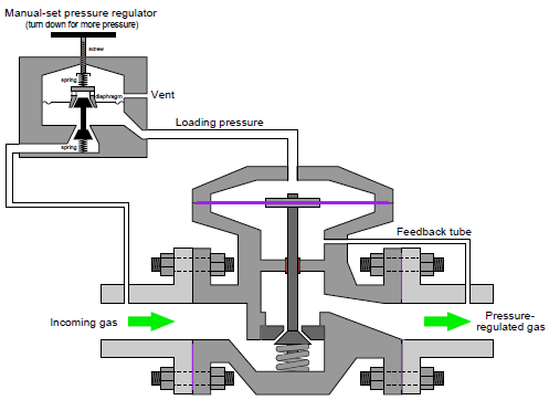 Instead of a stiff internal spring establishing the regulator’s pressure setpoint, the externally supplied loading pressure does that. Since this loading pressure is easily adjusted by turning the knob on the manual-set pressure regulator, the main regulator now becomes adjustable as well. The pilot mechanism controls the main gas throttling mechanism, hence the name pilot.