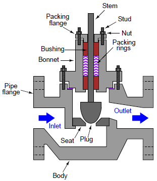 Packing in a sliding-stem valve fits in a section of the valve body called the bonnet, shown in this simplified diagram of a single-ported, stem-guided globe valve: