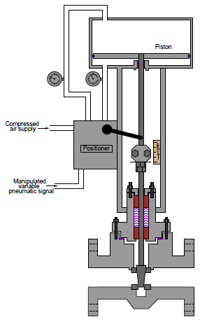 While positioners are beneficial on spring-equipped valve actuators, they are absolutely essential for some other styles of actuators. One example of an actuator requiring a positioner for proper operation is the springless, double-acting pneumatic piston actuator, shown here in this cutaway illustration actuating a gate valve body with a positioner attached:
