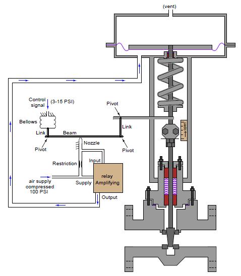 In this mechanism, an increasing signal pressure causes the beam to advance toward the nozzle, generating increased nozzle backpressure which then causes the pneumatic amplifying relay to send more air pressure to the valve actuator. As the valve stem lifts up, the upward motion imparted to the right-hand end of the beam counters the beam’s previous advance toward the nozzle. When equilibrium is reached, the beam will be in an angled position with the bellows’ motion balanced by valve stem motion.