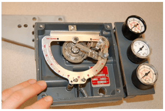 As the valve stem moves, a feedback lever rotates a cam underneath the bottommost portion of the D-ring. A roller-tipped “follower” riding on that cam translates the valve stem’s motion to another rocking motion on the beam, this time along the horizontal axis. Depending on how the cam has been fixed to the feedback shaft, this motion may rock the flapper farther away from the nozzle or closer toward the nozzle. This selection of cam orientation must match the action of the actuator: either direct (air to extend the stem) or reverse (air to retract the stem). The D-ring mechanism is rather ingenious, as it allows convenient adjustment of span by angling the flapper (baffle) assembly at different points along the ring’s circumference. If the flapper assembly is set close to horizontal, it will be maximally sensitive to bellows motion and minimally sensitive to valve stem motion, forcing the valve to move farther to balance small motions of the bellows (long stroke length). Conversely, if the flapper assembly is set close to vertical, it will be maximally sensitive to valve stem motion and minimally sensitive to bellows motion, resulting in little valve stroke (i.e. the bellows need to expand greatly in order to balance a small amount of stem motion).