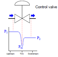 One of the most important performance parameters for a control valve with regard to flashing is its pressure recovery factor. This factor compares the valve’s total pressure drop from inlet to outlet versus the pressure drop from inlet to the point of minimum pressure within the valve.