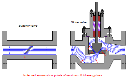 In most control valves, the dominant mechanism of energy dissipation comes as a result of turbulence introduced to the fluid as it travels through constrictive portions of the valve trim. The following illustration shows these constrictive points within two different control valve types (shown by arrows):
