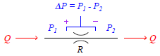 Next, we will solve for a quotient with pressure drop (P1 − P2) in the numerator and flow rate Q in the denominator so the equation bears a resemblance to Ohm’s Law (R = V/I ):