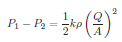 Either side of the last equation represents a sort of “Ohm’s Law” for turbulent liquid restrictions: the left-hand side expressing fluid “resistance” in the state variables of pressure drop and volumetric flow, and the right-hand term expressing fluid “resistance” as a function of fluid density and restriction geometry. We can see how pressure drop (P1 − P2) and volumetric flow rate (Q) are not linearly related as voltage and current are for resistors, but nevertheless we still have a quantity that acts like a “resistance” term: