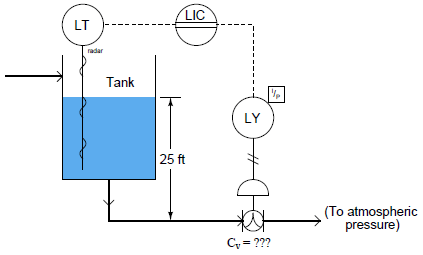 Given this fact, it may seem safe to choose a valve sized much larger than what is needed, just to avoid the possibility of not having enough flow capacity. For instance, consider this control valve sizing problem, where a characterized ball valve controls the flow rate of water out of a surge tank to maintain a constant water level 25 feet higher than the height of the valve: