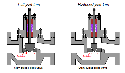 Reduced-port trim for a cage-guided globe valve often consists of nothing more than a new cage, having smaller ports in the cage than standard. Thus, reduced-port trim for a cage-guided globe valve may utilize the exact same plug and seat as the full-port trim for the same cage-guided globe valve:
