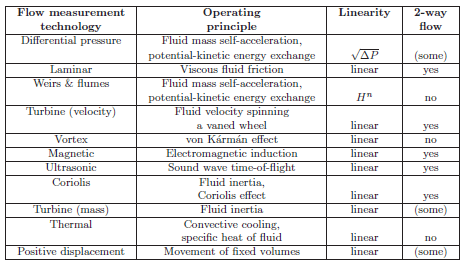 Every flow-measuring instrument exploits a physical principle to measure the flow rate of the fluid stream. Understanding each of these principles as they apply to different flow-measurement technologies is the first and most important step in properly applying a suitable technology to the measurement of a particular process stream flow rate. The following table lists the specific operating principles exploited by different flow measurement technologies: