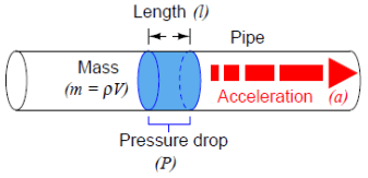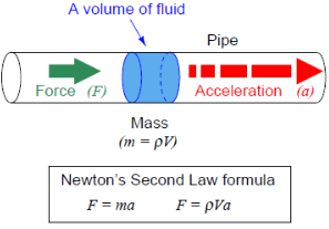 All fluids possess mass and therefore require force to accelerate just like solid masses. If we consider a quantity of fluid confined inside a pipe, with that fluid quantity having a mass equal to its volume multiplied by its mass density (m = ρV, where ρ is the fluid’s mass per unit volume), the force required to accelerate that fluid “plug” would be calculated just the same as for a solid mass: