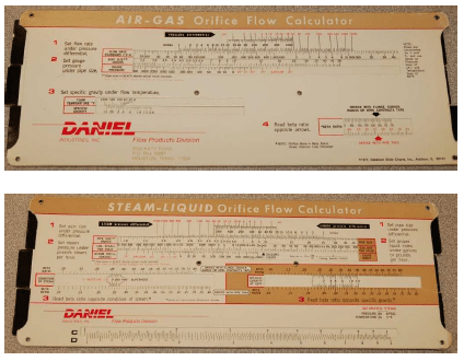 In the days before ubiquitous personal computers and the Internet, some orifice plate manufacturers provided customers with paper “slide rule” calculators to help them select appropriate orifice plate sizes from known process parameters. The following photographs show the front and back sides of one such slide rule: