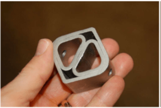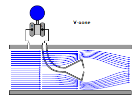 This cone is hollow, with a pressure-sensing port on the downstream side allowing for easy detection of fluid pressure near the vena contracta. Upstream pressure is sensed by another port in the pipe wall upstream of the cone. The following photograph shows a V-cone flow tube, cut away for demonstration purposes: