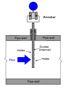 A section of the Annubar tube clearly shows the porting and dual chambers, designed to bring upstream (stagnation) and downstream pressures out of the pipe to a differential pressure-sensing instrument: