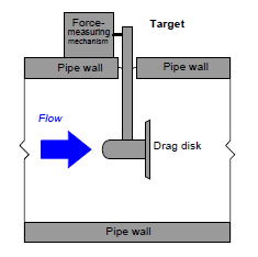 A less sophisticated realization of the stagnation principle is the target flow sensor, consisting of a blunt “paddle” (or “drag disk”) inserted into the flow stream. The force exerted on this paddle by the moving fluid is sensed by a special transmitter mechanism, which then outputs a signal corresponding to flow rate (proportional to the square of fluid velocity, just like an orifice plate):