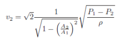 The result shows us how to solve for the fluid velocity at the venturi throat (v2) based on a difference in pressure measured between the mouth and the throat (P1 −P2). We are only one step away from a volumetric flow equation here, and that is to convert velocity (v) into flow rate (Q). Velocity is expressed in units of length per time (feet or meters per second or minute), while the volumetric flow is expressed in units of volume per time (cubic feet or cubic meters per second or minute). Simply multiplying throat velocity (v2) by throat area (A2) will give us the result we seek: