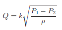 Please note how many constants we have in this equation. For any given venturi tube, the mouth and throat areas (A1 and A2) will be fixed. This means nearly half the variables found within this rather long equation are constant for any given venturi tube, and therefore do not change with pressure, density, or flow rate. Knowing this, we may re-write the equation as a simple proportionality: